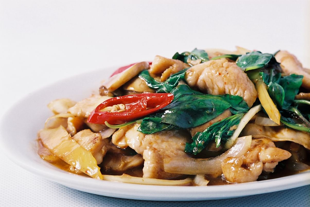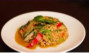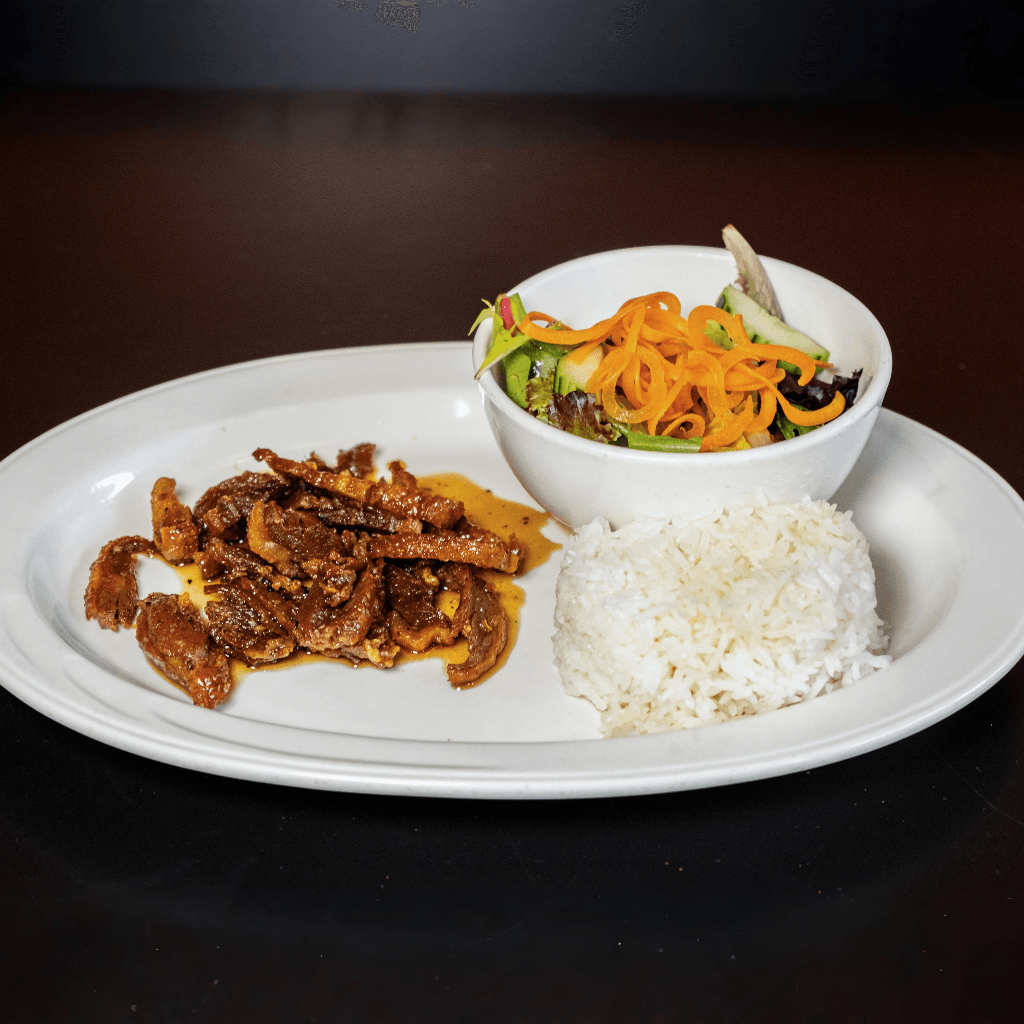 Sautéed with basil leaves, onions, bell pepper, scallions, chili pepper. served with white rice and your choice of soup or salad
