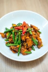Chicken, beef, pork, vegetarian duck or tofu sauteed with green beans, red curry paste, lime leaf and bell pepper