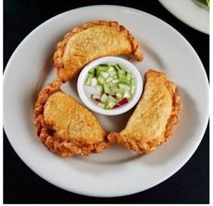 Thai puff pastry, ground chicken, potato, onion, curry powder served with cucumber salad