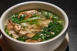 Clear minced chicken soup, bean thread noodles, scallions, onions, mushroom and chinese vegetable