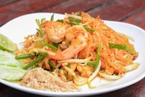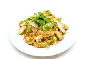 Thai noodles stir-fried with egg, crushed peanuts, bean sprouts, dried radish, scallion, and red onion. served with soup or salad (does not come with a side of rice)