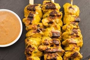 Grilled skewered chicken served with peanut sauce and cucumber salad