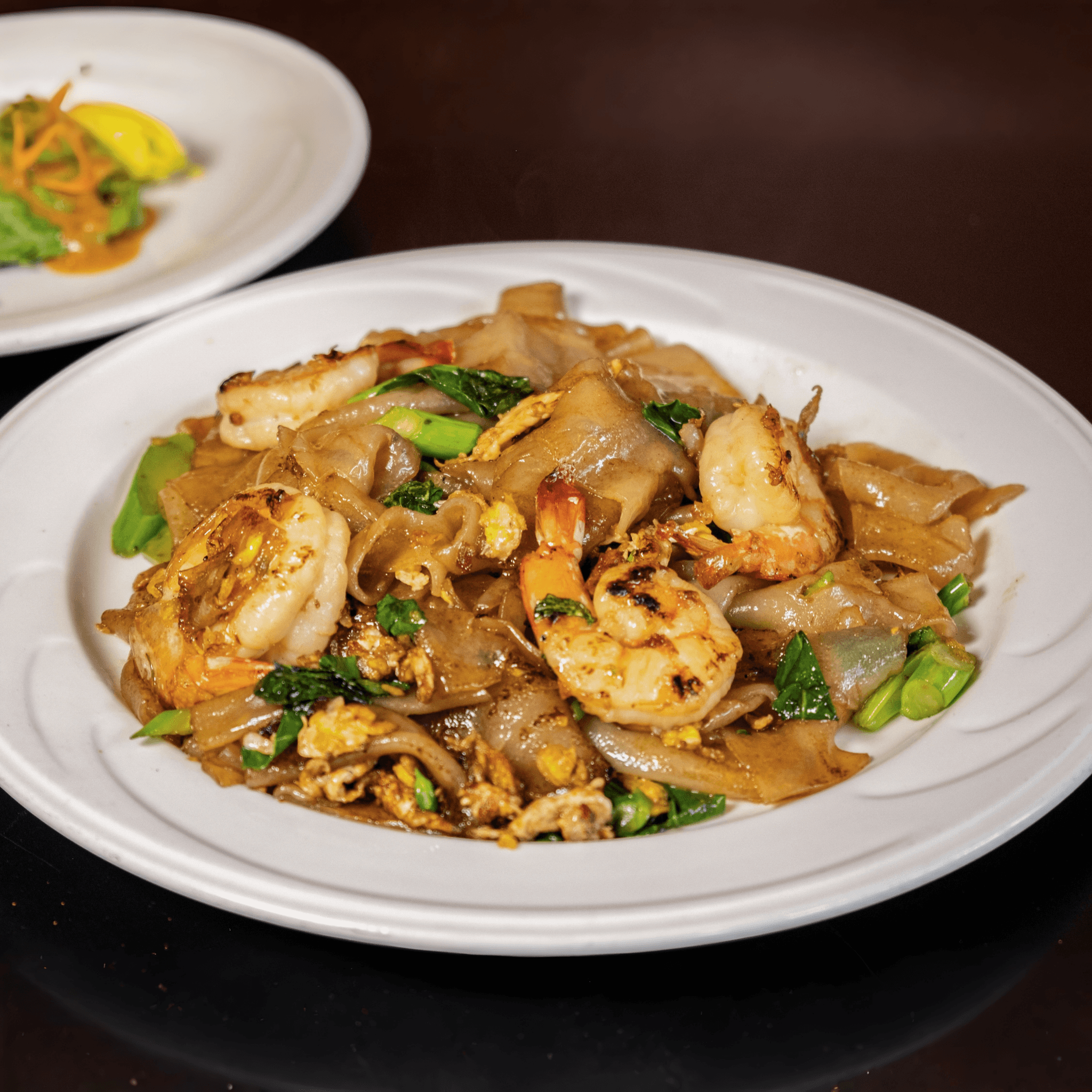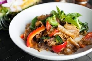 Broad rice noodles stir-fried with chili peppers, basil leaves, onion, bell pepper, tomato, scallion. served with soup or salad (does not come with a side of rice)