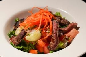 Sliced grilled steak served with sauteed mixed chinese vegetables and garlic sauce