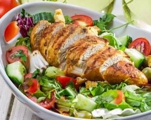 Grilled chicken breast on bed of mixed greens, with tomatoes, carrots, cucumbers and soy sauce vinaigrette dressing
