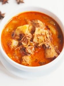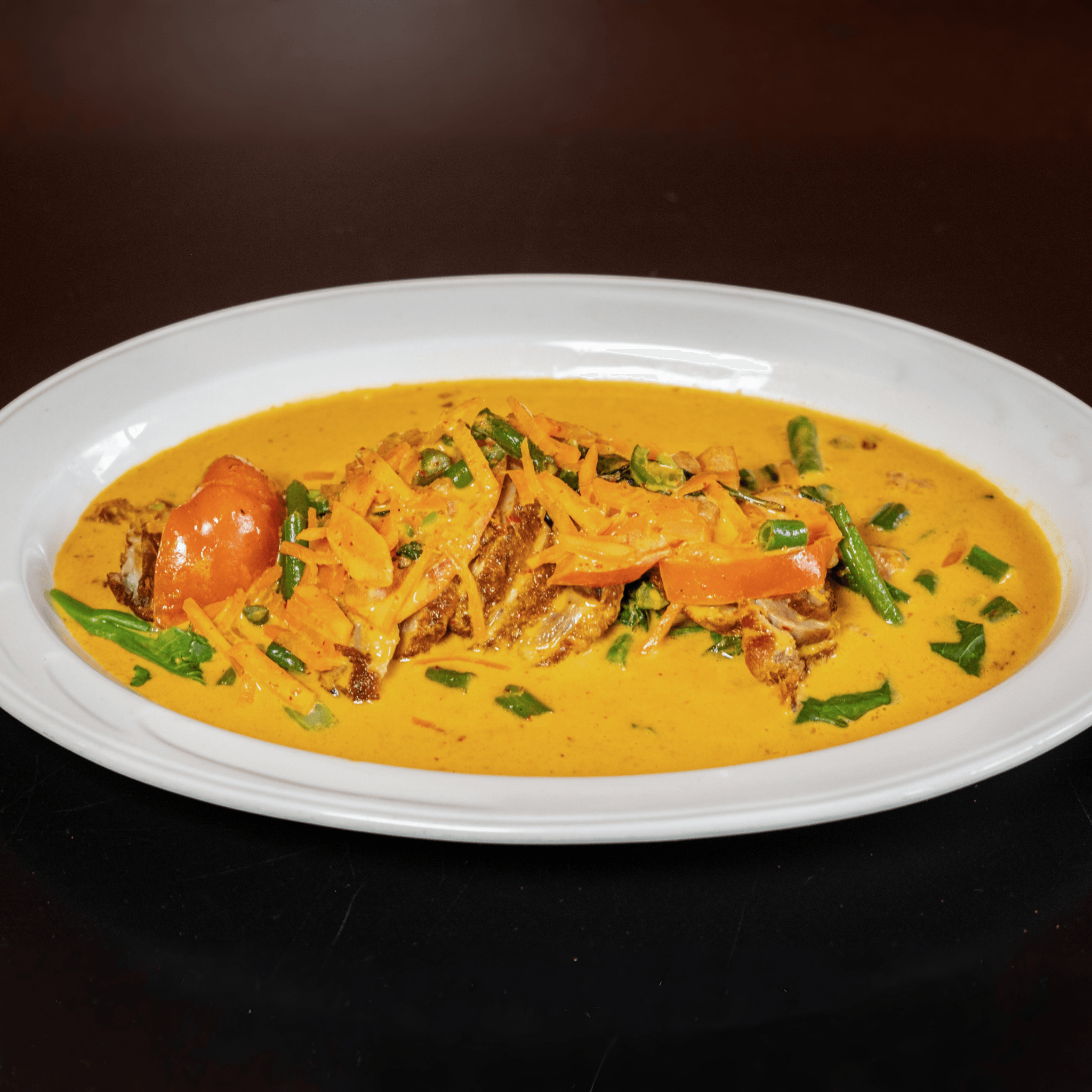 Deep fried half duck with tomatoes and vegetables in curry sauce and coconut milk