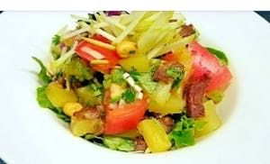Roast duck tossed with red onions, green apples, pineapple chunks, tomatoes, chilies, lime juice and peanuts