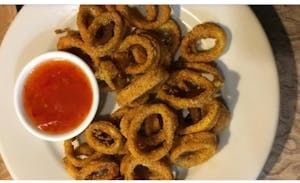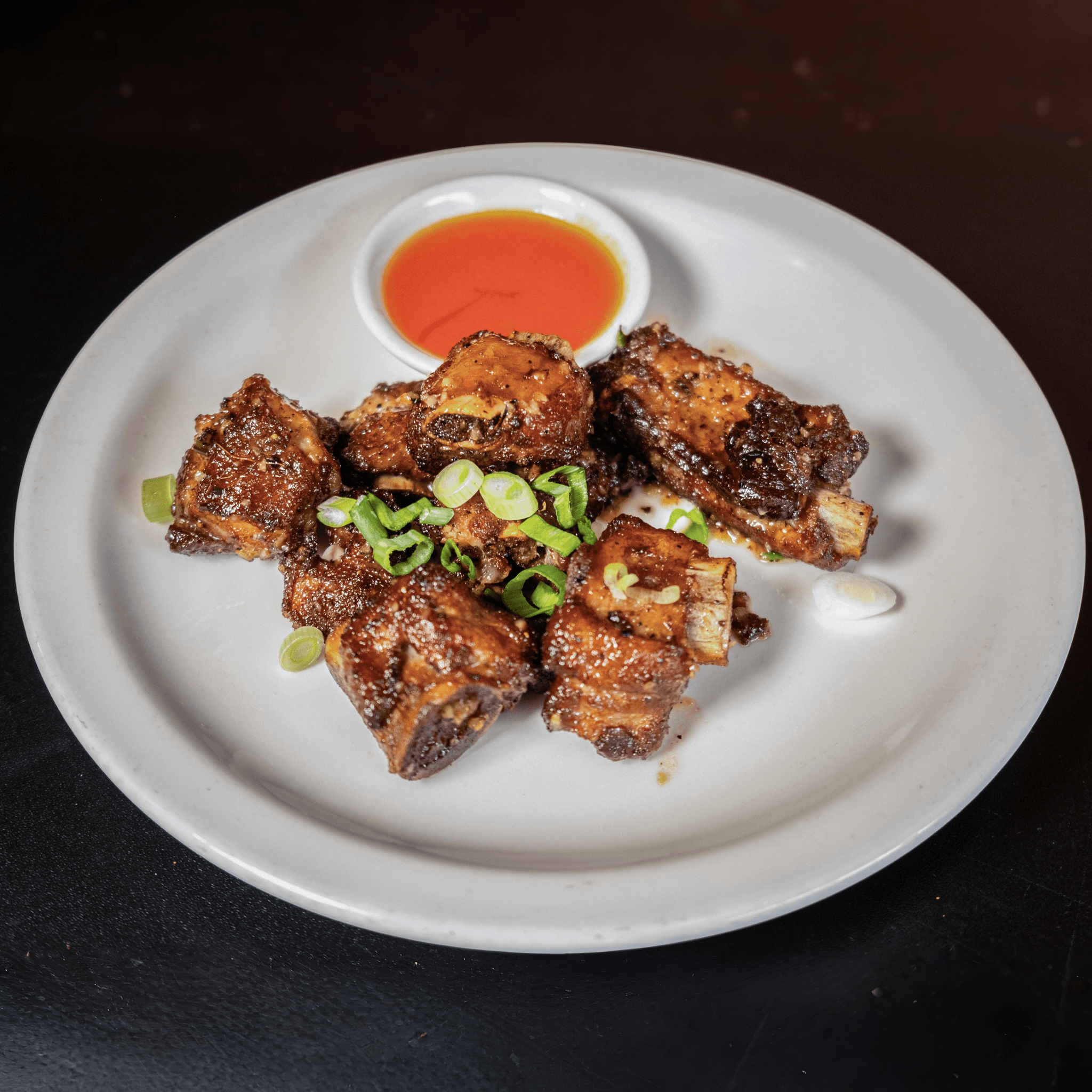Pork spare ribs sauteed in garlic and ground black pepper served with hot chili sauce