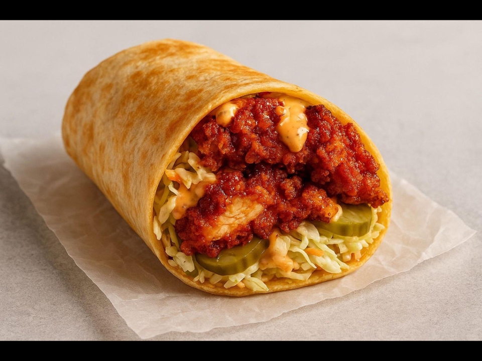 Chopped Crispy Chicken with Slaw, Pickles and YoYo Sauce wrapped in a tortilla
