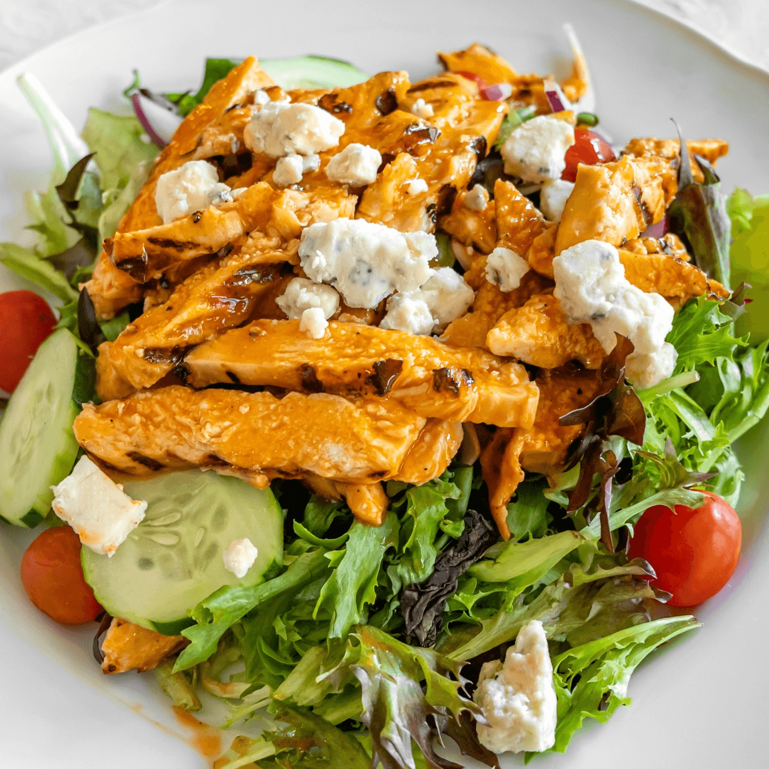Diced Chicken Breast Tossed In Spicy Buffalo Sauce Drizzled With Bleu Cheese