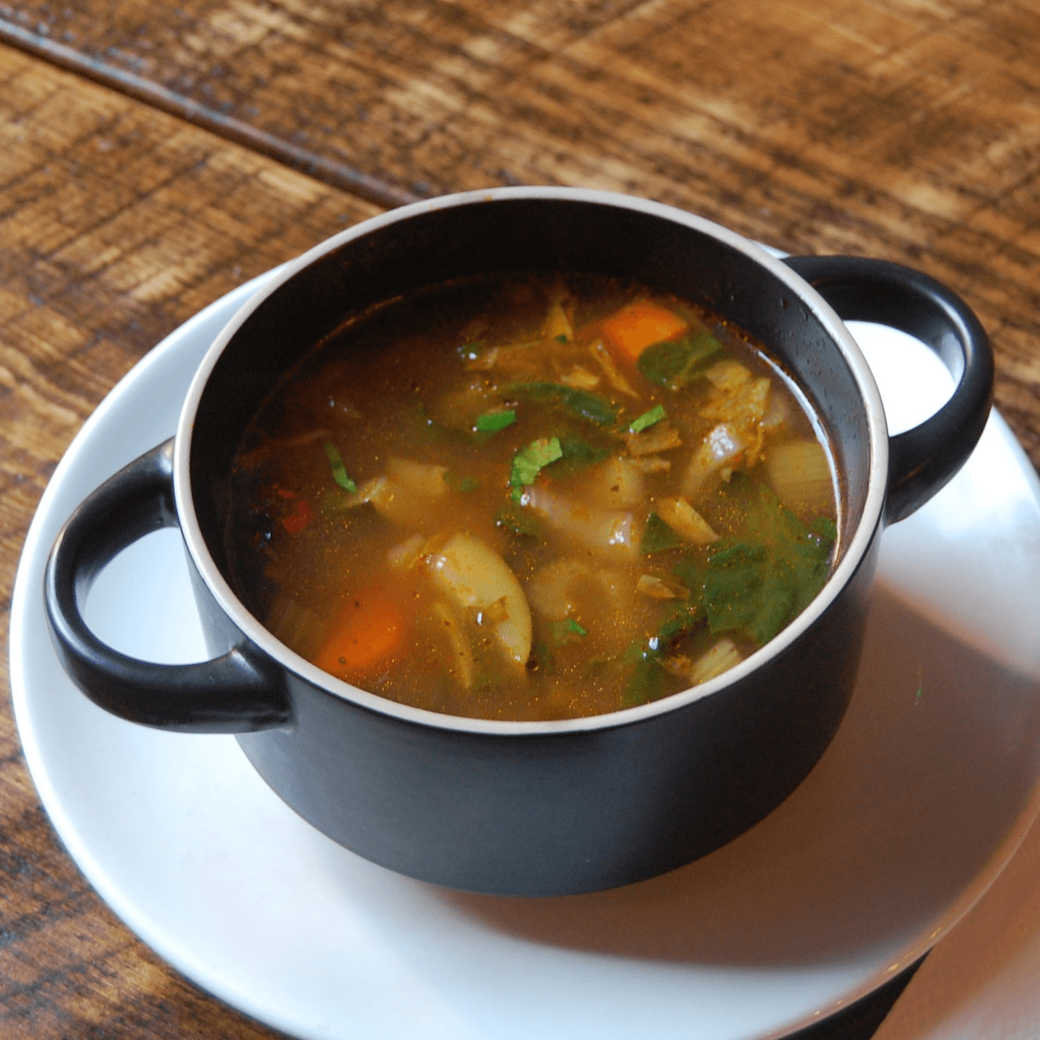 Made Fresh Daily, Hearty Chicken Broth With Shredded Chicken Vegetables And Spaghetti Noodles In A 16 OZ Cup