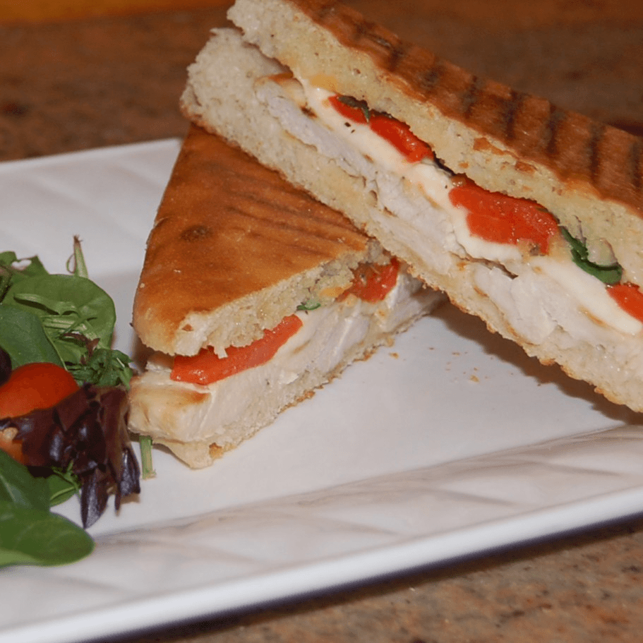 Gril!ed Chicken With Fresh Mozzarella Roasted Red Peppers Extra Virgin Olive Oil And Fresh Basil On Our Homemade Panini Bread