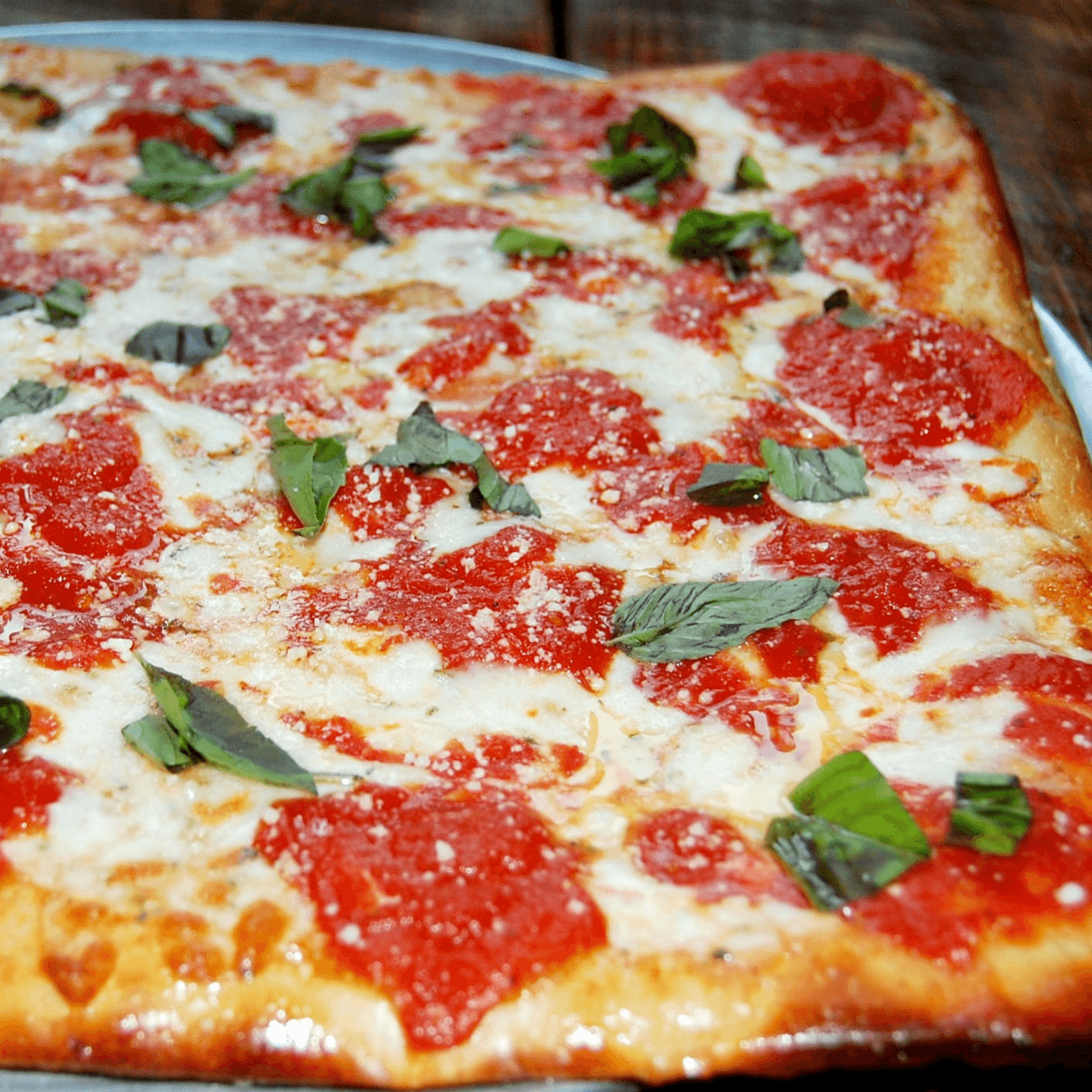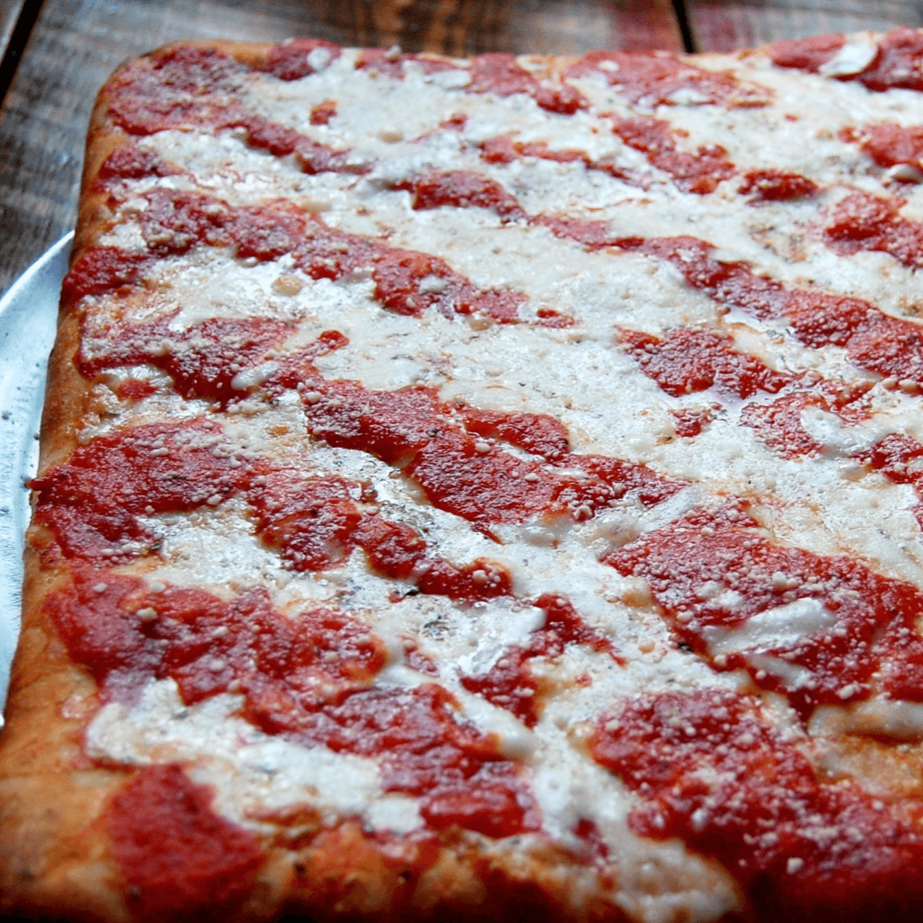 Thin Square Crust 16 Inch Pizza With Crushed San Marzano Style Tomatoes, Shredded Mozzarella, Garlic, Extra Virgin Olive Oil And Fresh Basil. Topped With Pecorino Romano Cheese.