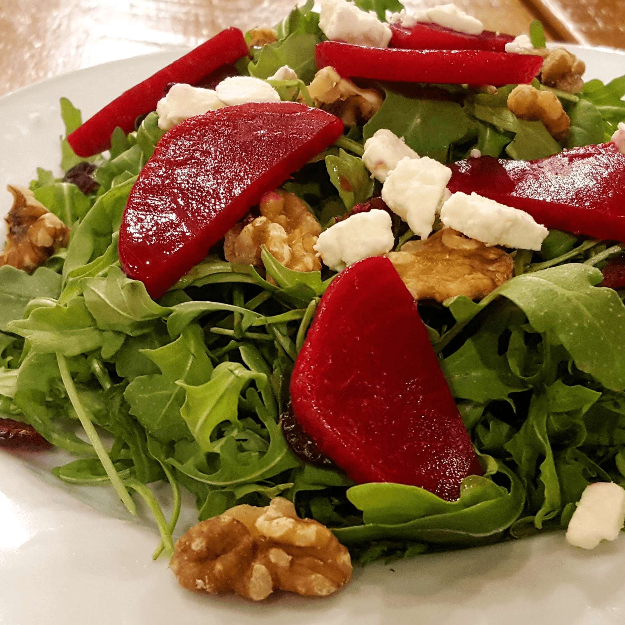 Baby Arrugula With Sliced Apples Goat Cheese Walnuts Dried Cranberry & Chick Peas With Sliced Cucumbers And Cherry Tomatoes